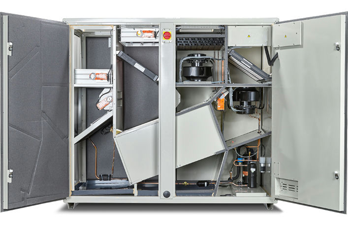 - Vstavané tepelné čerpadlo s rotačným kompresorom a vysokým COP. Voliteľný vstavaný vodou chladený kondenzátor na ohrev bazéna alebo úžitkovej vody.